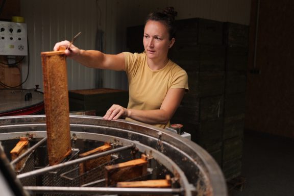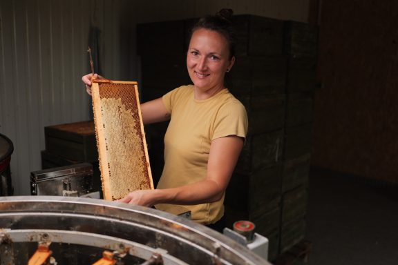 Die reifen, verdeckelten Waben entnehmen wir behutsam und bringen sie zu uns nach Hause auf den Bienenhof um sie auszuschleudern. Der Honig läuft aus der Schleuder durch ein grobes Sieb um ihn von den Wachsdeckeln zu säubern und wird zunächst in lebensmittelechte Gefäße gefüllt bis er nach der intensiven Bienensaison weiterverarbeitet wird. Dazu wird der Honig schonend leicht erwärmt und nun durch ein sehr feines Sieb gegeben um alle noch so kleinen Wachspartikel heraus zu sieben. Soll der Honig flüssig ins Glas (z.B. Akazienhonig) kann er so nun direkt abgefüllt werden. Soll er eine streichzarte cremige Konsistenz bekommen wird er in einem großen Edelstahlfass mit aktiver Kühlung mehrere Tage cremig gerührt (ähnlich wie Butter) bevor er abgefüllt werden kann.